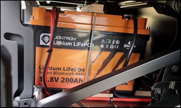 - LIONTRON LiFePO4 12,8V 200Ah LX Smart BMS mit Bluetooth (unter der hinteren Sitzbank verbaut)