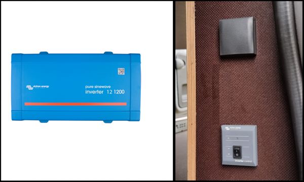 - Wechselrichter 1200W: Victron Energy Phoenix 12/1200 inkl. Kabel 2m und Sicherung (im linken Seitenkasten verbaut)